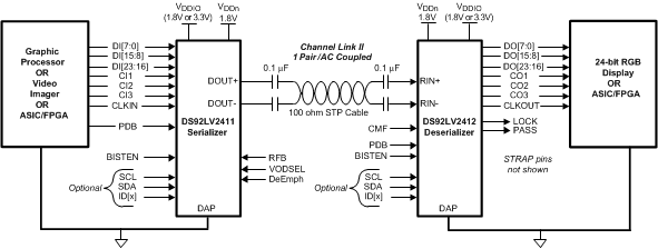 The DS92LV2411 (Serializer) and DS92LV2412 (Deserializer) chipset translates a parallel 24–bit LVCMOS data interface into a single high-speed CML serial interface with embedded clock information. This single serial stream eliminates skew issues between clock and data, reduces connector size and interconnect cost for transferring a 24-bit, or less, bus over FR-4 printed circuit board backplanes, differential or coax cables.