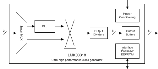 The LMK03318 is an ultra-low-noise PLLatinumTM clock generator with one fractional-N frequency synthesizer with integrated VCO, flexible clock distribution/fanout, and pin-selectable configuration states stored in on-chip EEPROM. The device can generate multiple clocks for various multi-gigabit serial interfaces and digital devices, thus reducing BOM cost and board area and improving reliability by replacing multiple oscillators and clock distribution devices. The ultra-low jitter reduces bit-error rate (BER) in high-speed serial links.